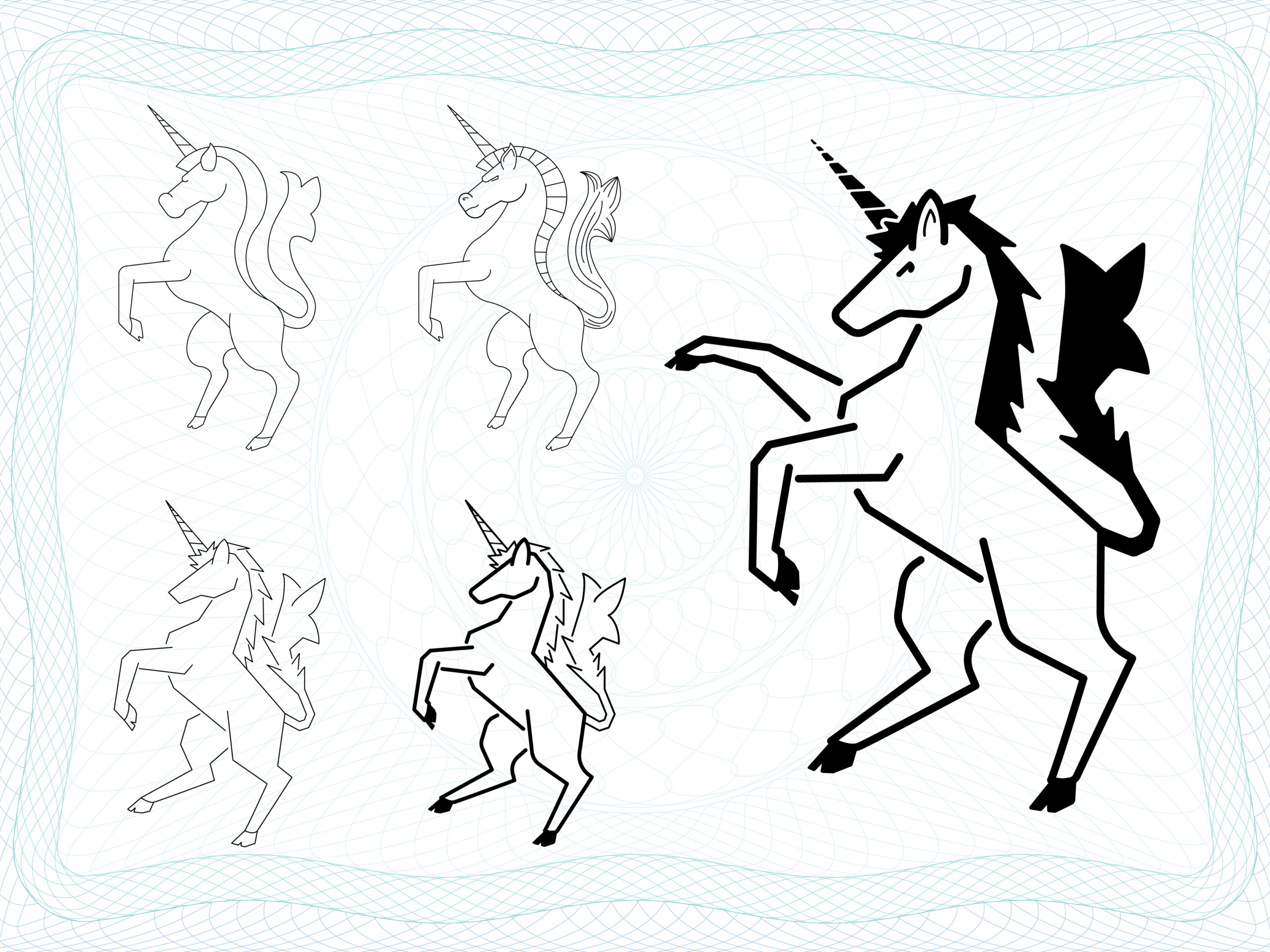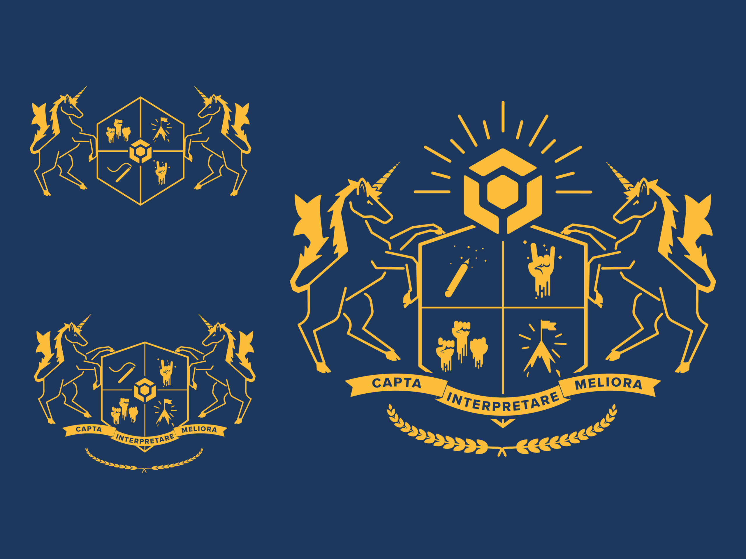 After awhile I settled on making a more traditional crest-style cover, which led to looking at heraldic designs. Heraldic crests incorporate a lot of iconography, and usually have some sort of shield shape in the center, flanked by a large animal. Contentsquare uses small icons to help illustrate their core values, so I thought it would be perfect to include those. The icon for Uniqueness is a unicorn, which worked perfect as a replacement for heraldic lions and horses. Once I had the basic components figured out, it was just a matter of putting them together, and designing them to match both heraldic design and Contentsquare’s general style.