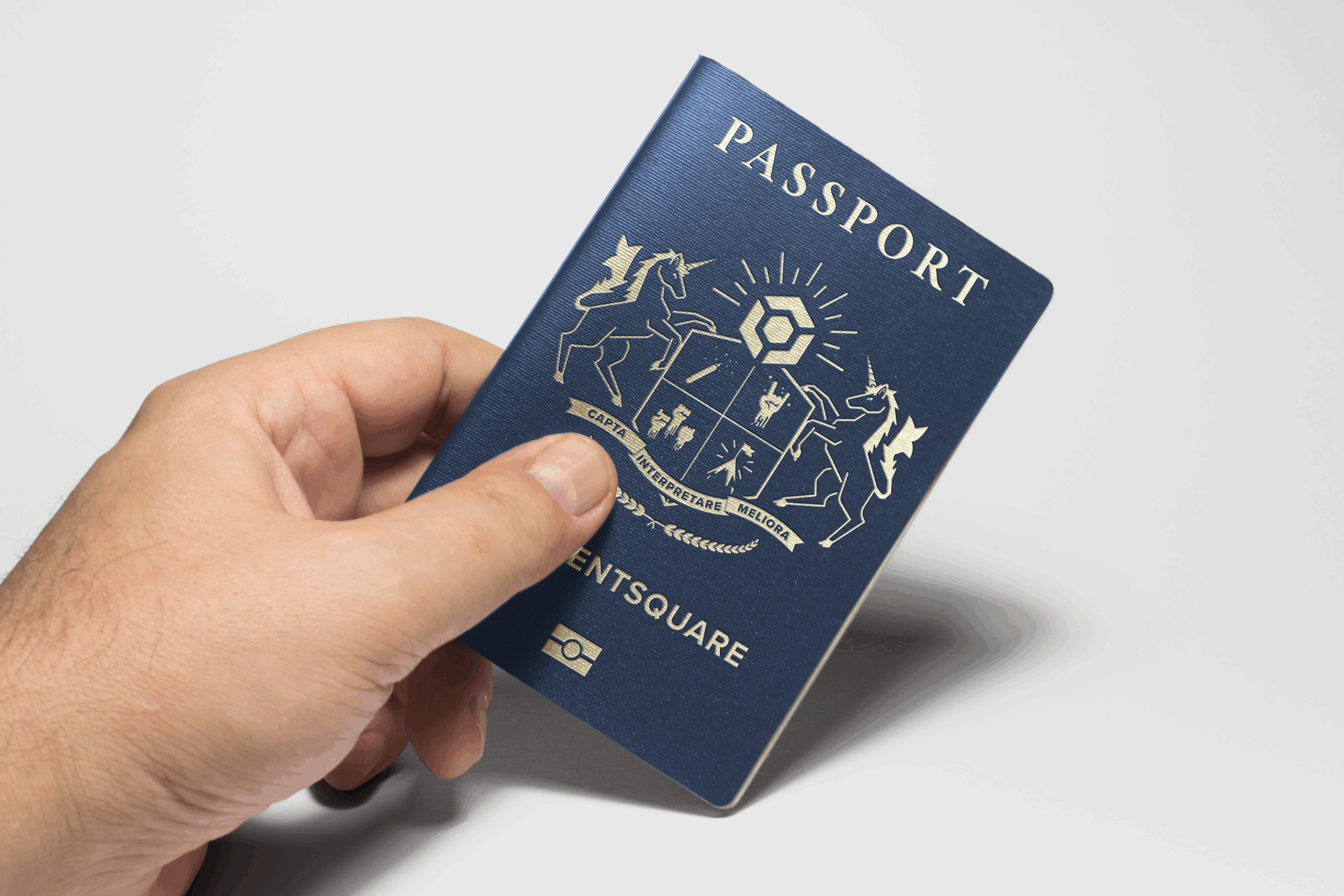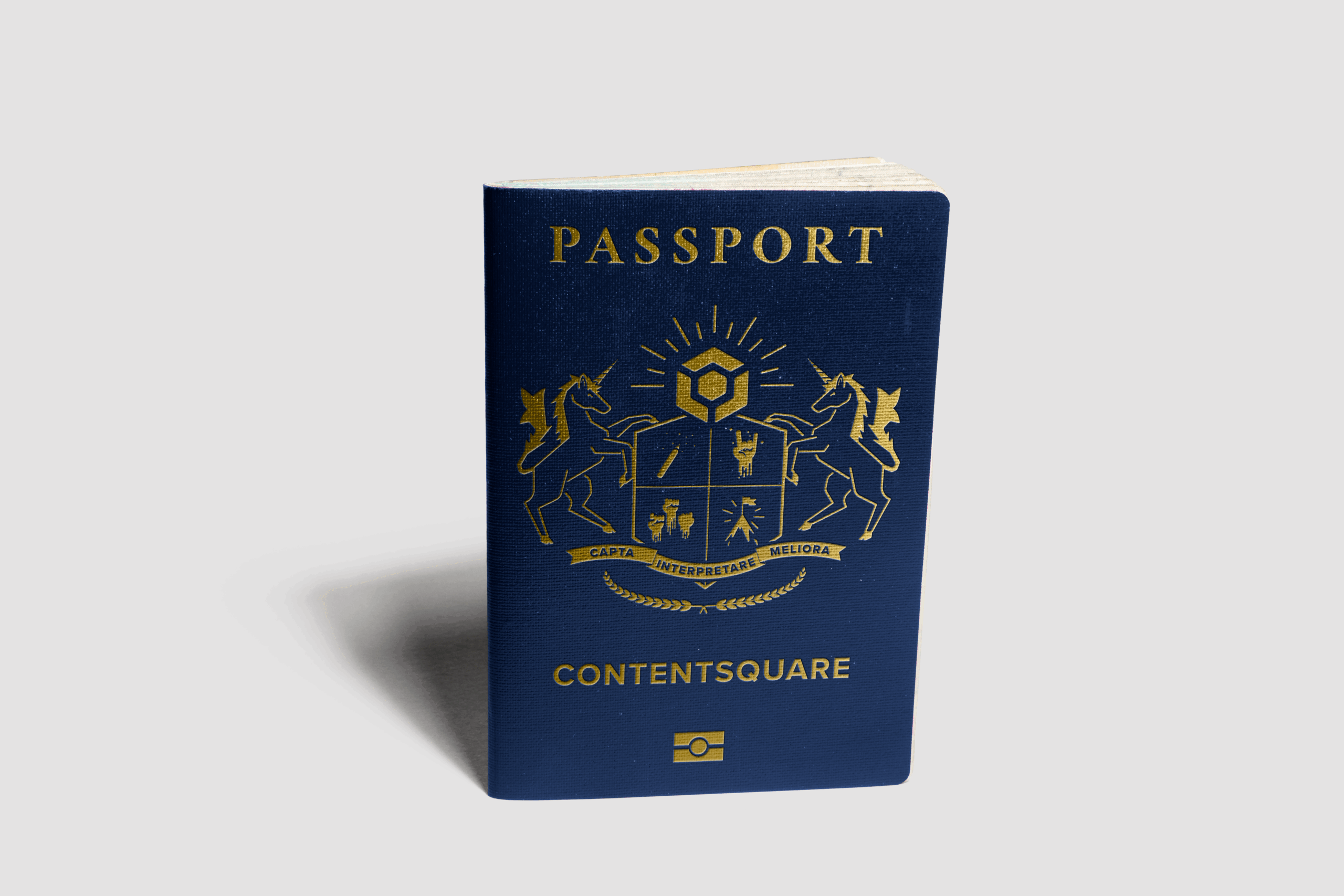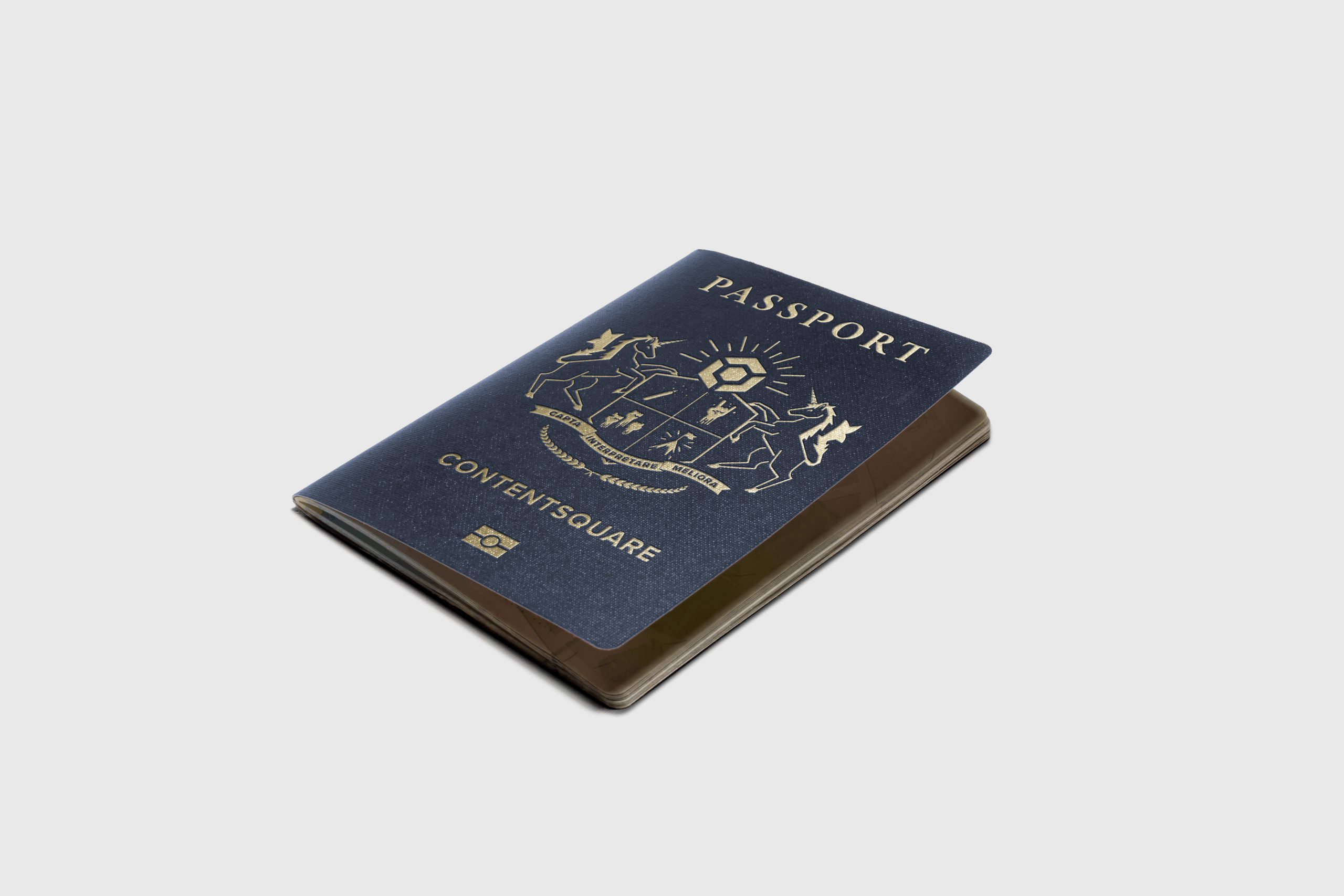 I knew instantly that I wanted the note to look like a passport, so it could be placed inside the leather cover. I could have just taken an image of the cover of a US or French passport (Contentsquare is a French company) and used that as the note, but I saw an opportunity. I wasn’t given many chances to create custom graphics for projects, often having to use preexisting designs from other designers or taking graphics off of Adobe Stock, so I took the initiative and decided to design a custom cover crest as if Contentsquare was a country with it’s own passport.