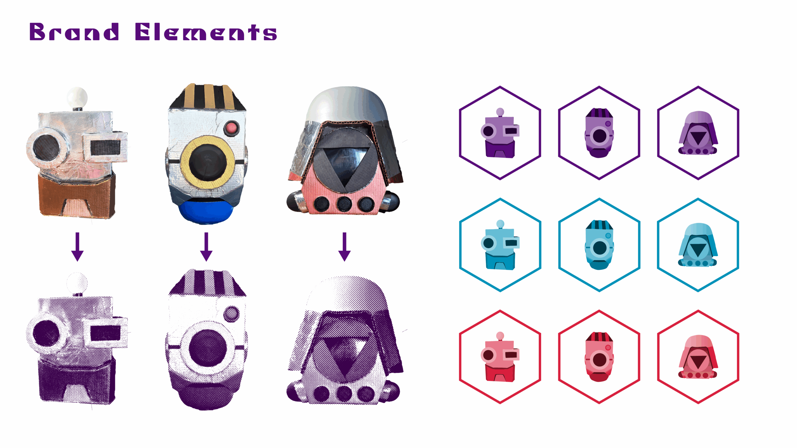 However, I really liked some of the regular robot heads I designed, and so I had the idea to use them as separate brand elements. I picked out three that I liked best, and decided to actually construct them using recycling that I had lying around. It was all done freehand using my sketches as reference, and I really loved the process of figuring out the best way to construct each piece, and what material to use.