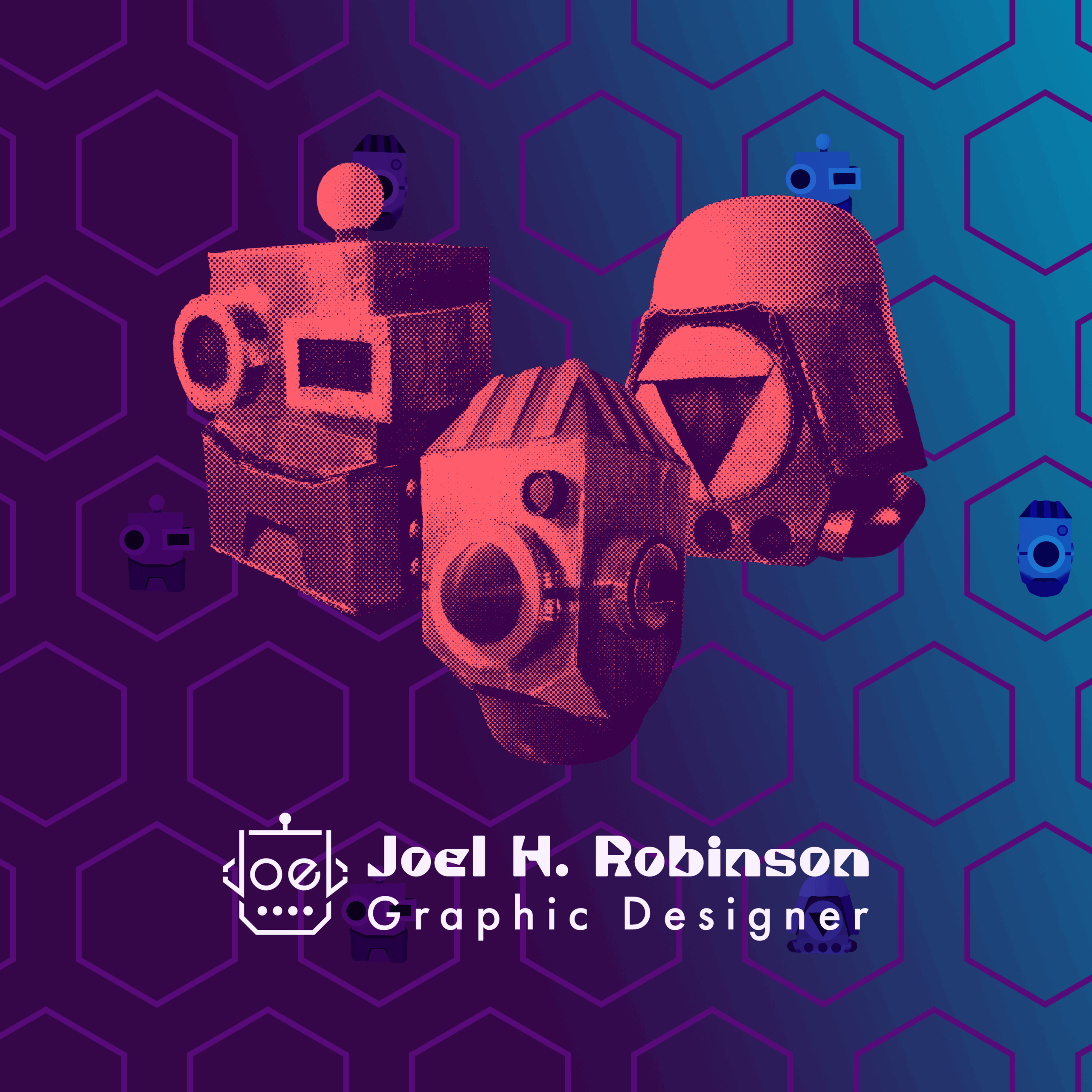 I felt that just using the robot heads as-is didn’t give the right feel, and so I applied a halftone and duotone photo treatment to each to complete the look. This will allow me to use them in a wider variety of situations, and to change the colors as needed.
