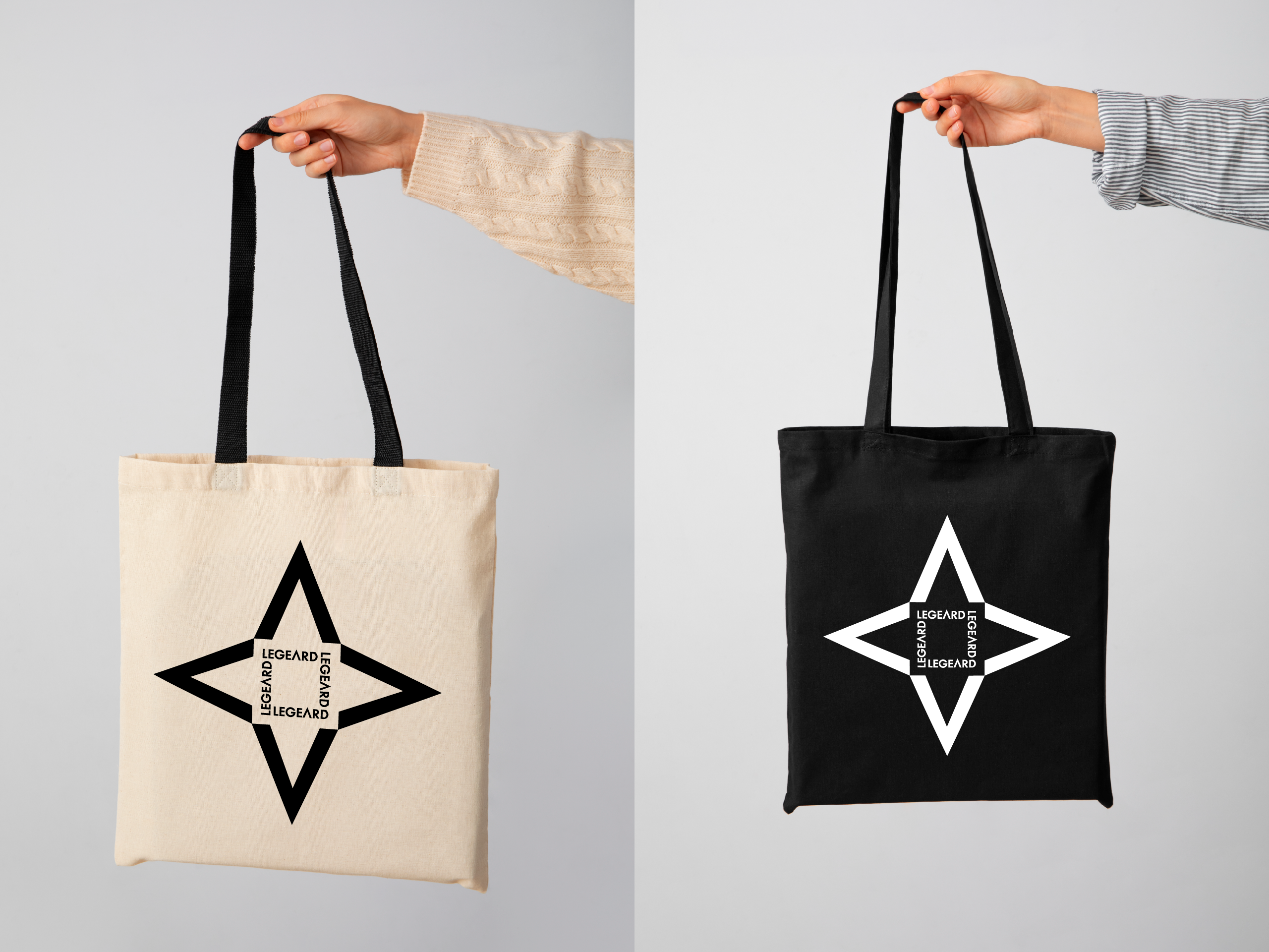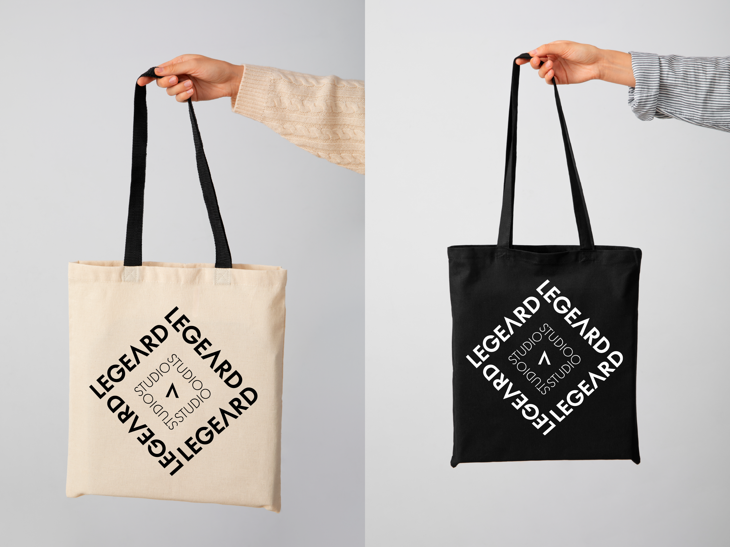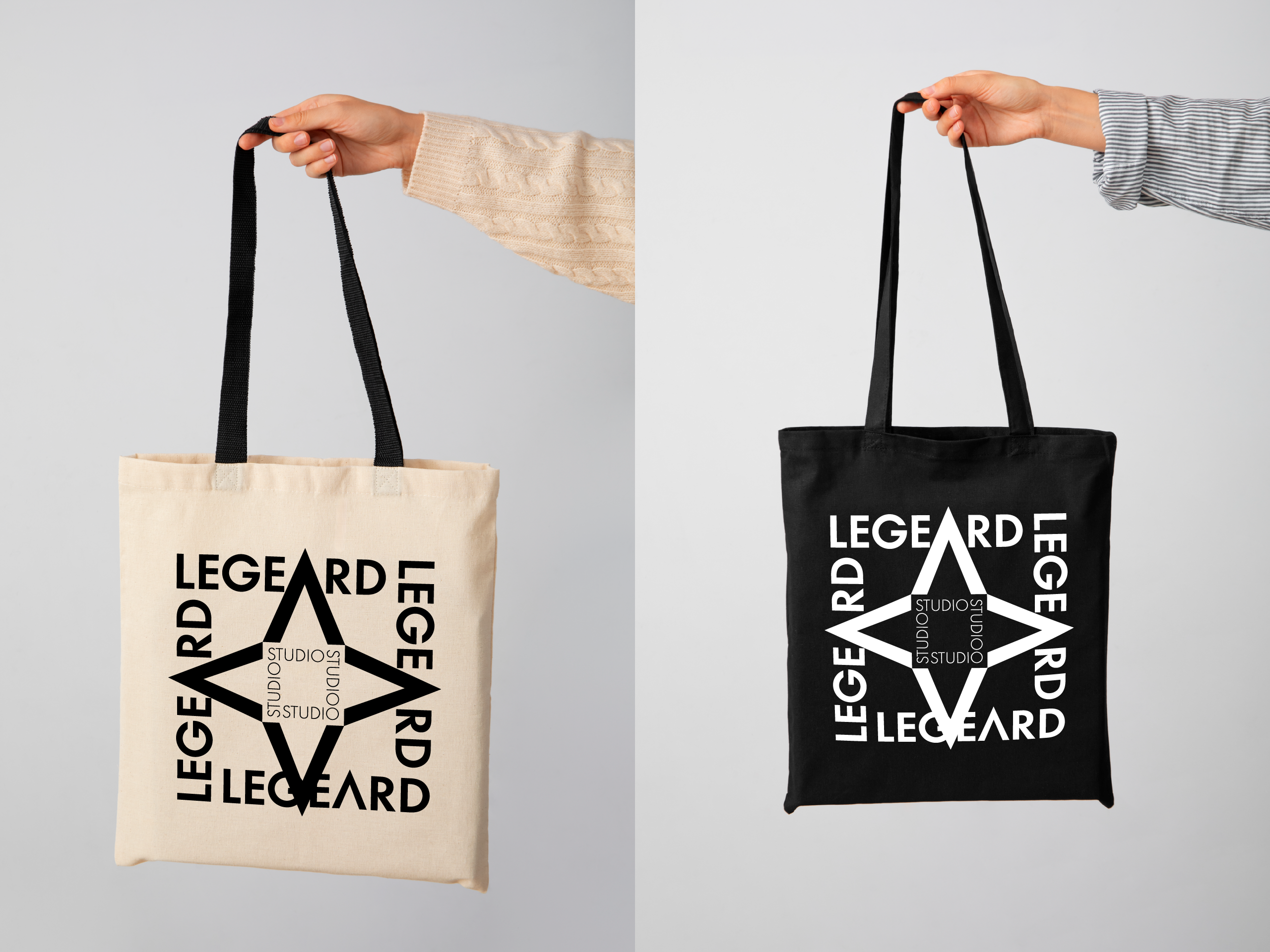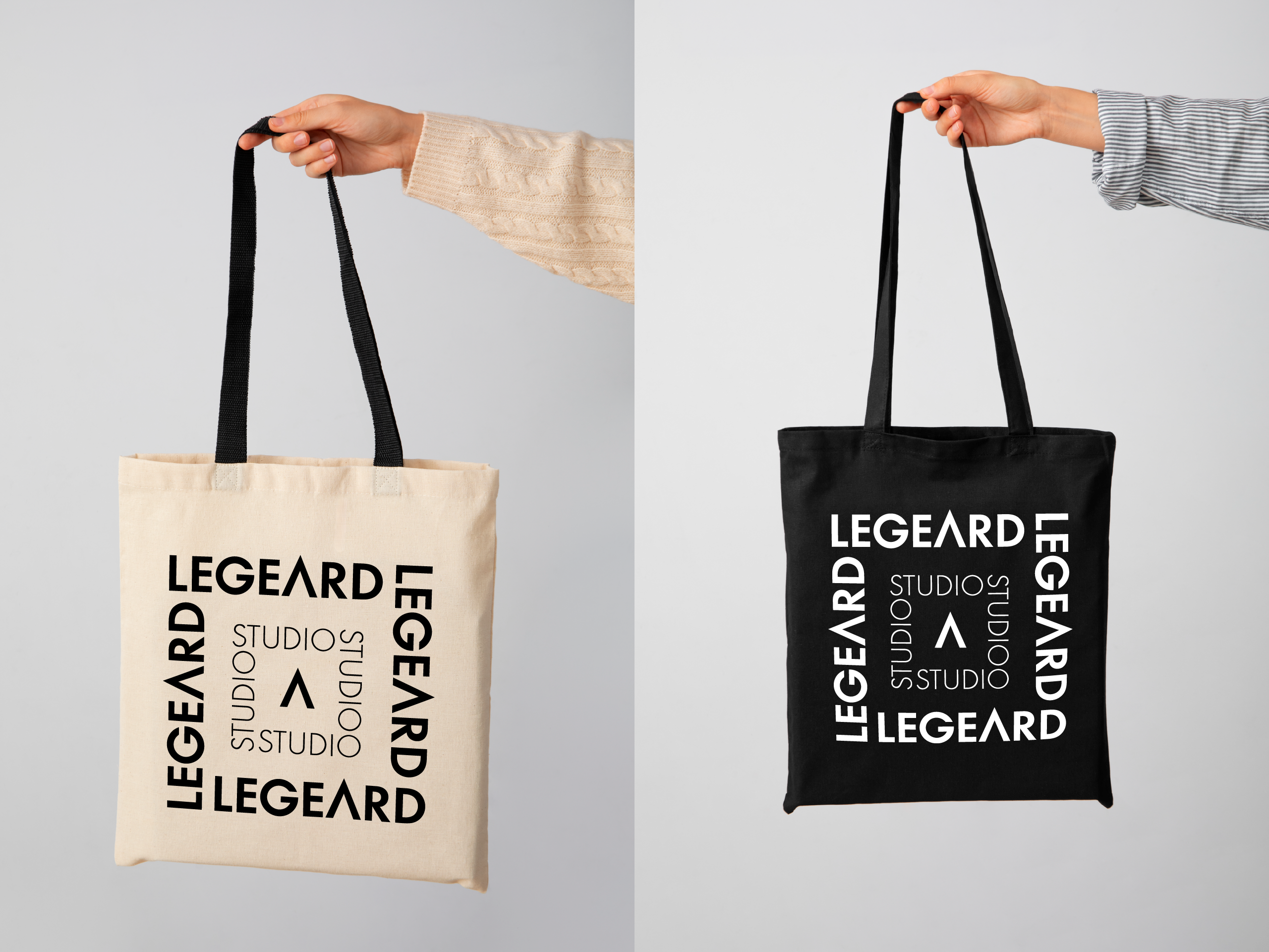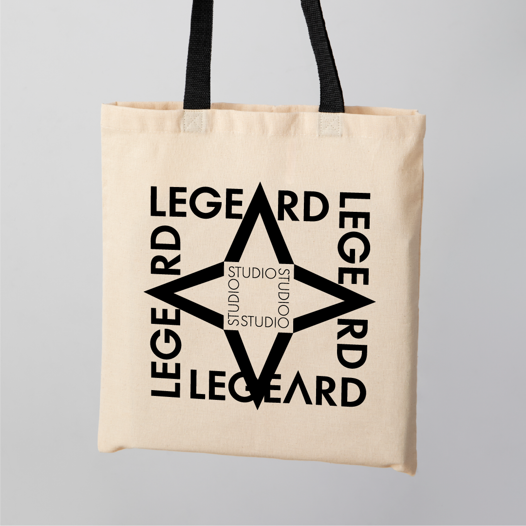 I then pivoted to trying designs of more simple geometric shapes using both the logomark and logotype. I realized I could orient the studio name into a square, with the bolder “Legeard” creating an outer square, and the lighter “Studio” to create an inner square. I then incorporated the logomark in the center to draw focus and complete the look.