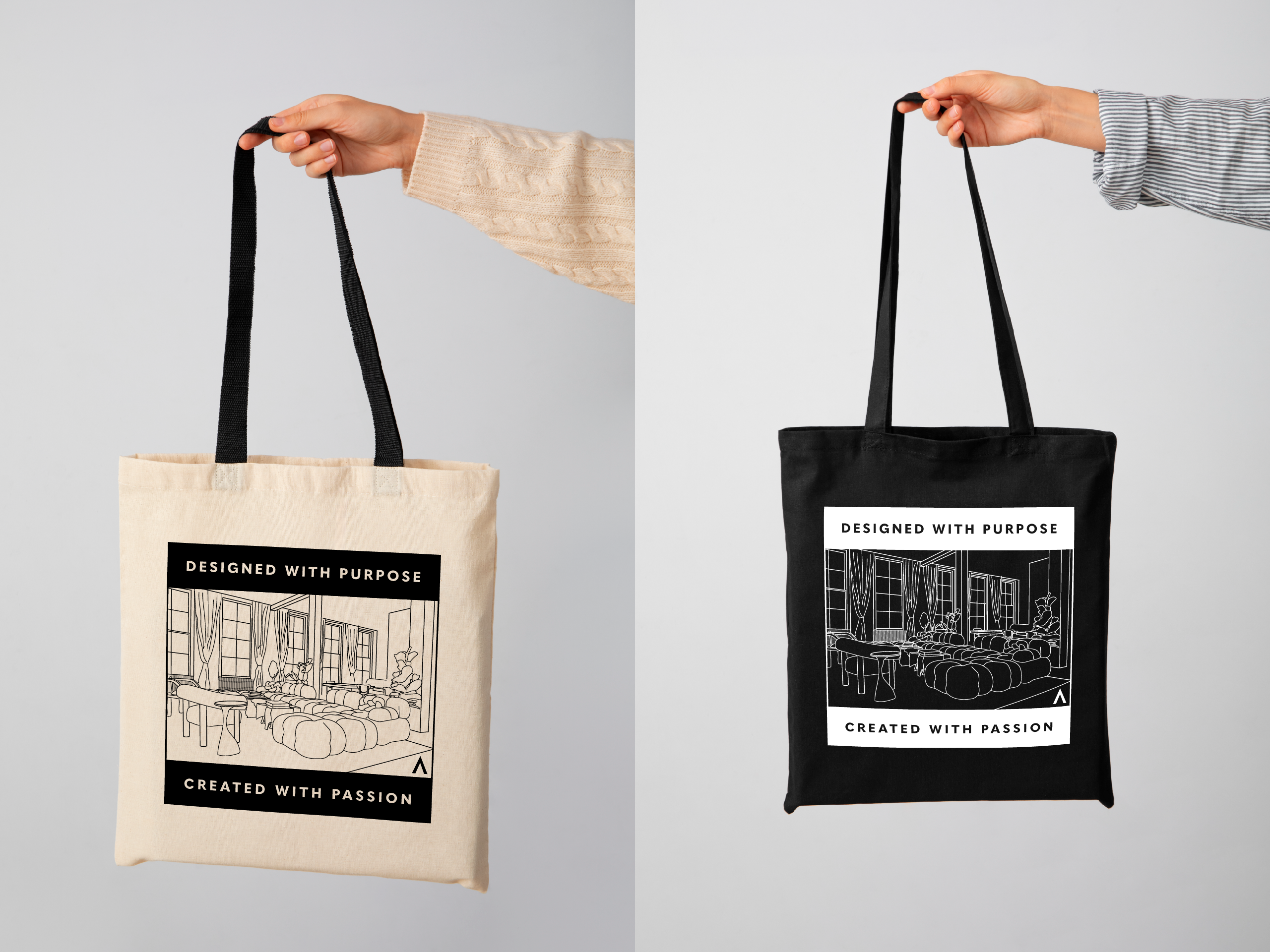 As a final exploration, I thought about how we wanted to give these to our clients upon completion of their interior design. With this in mind, I took a photo from a previously finished residential space and traced it in Illustrator, creating a clean outline design of the photo. My thinking on this was if we wanted our business to expand through word of mouth from our clients, giving them a customized design on something they would actually use in their day-to-day life would increase the chance of them talking us up while showing off their custom bag to their friends. It felt a little bare by itself though, so I incorporated a tagline we had used previously, and placed everything inside an outlined box to bring it together.